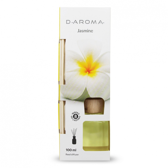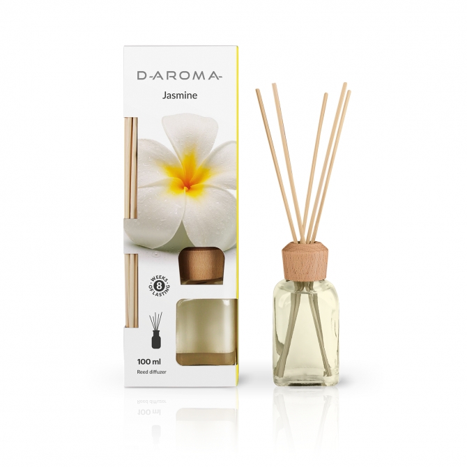 Dyfuzor zapachowy D-Aroma to szklany flakon o pojemności 100ml z drewnianym korkiem oraz patyczkami, których optymalna ilość zapewnia regulowanie intensywności zapachu według indywidualnych potrzeb. W optymalnych warunkach zapach towarzyszy nam do 8 tygodni. Szklany flakon dzięki swojej formie pasuje do każdego wystroju i wnętrza.