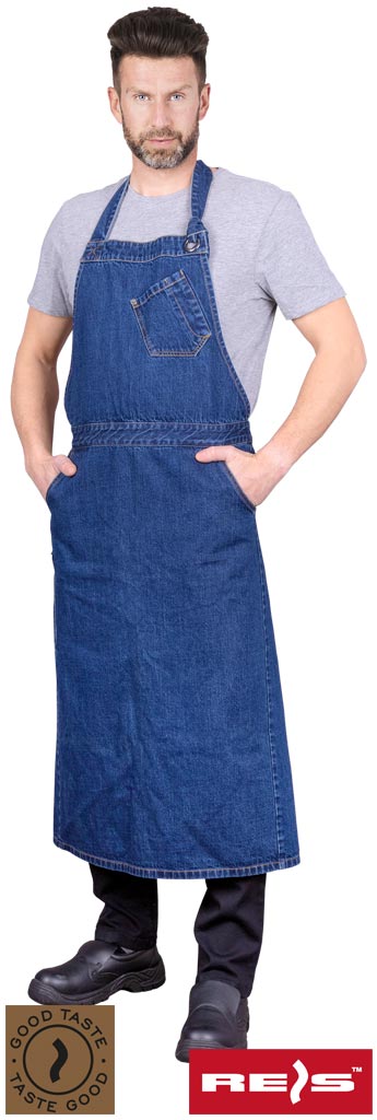 Fartuch ochronny wykonany z jeansu zakładany na szyję.