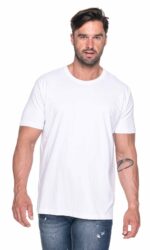 Opis: miękki i przyjemny materiał single jersey typu slub; bawełna organiczna; dekolt typu v-neck; surowe wykończenie dekoltu; potrójnie wywinięty i przeszyty brzeg rękawka; taśma wzmacniająca typu twill na karku; taśma wzmacniająca na ramionach; podwójny dolny szew.