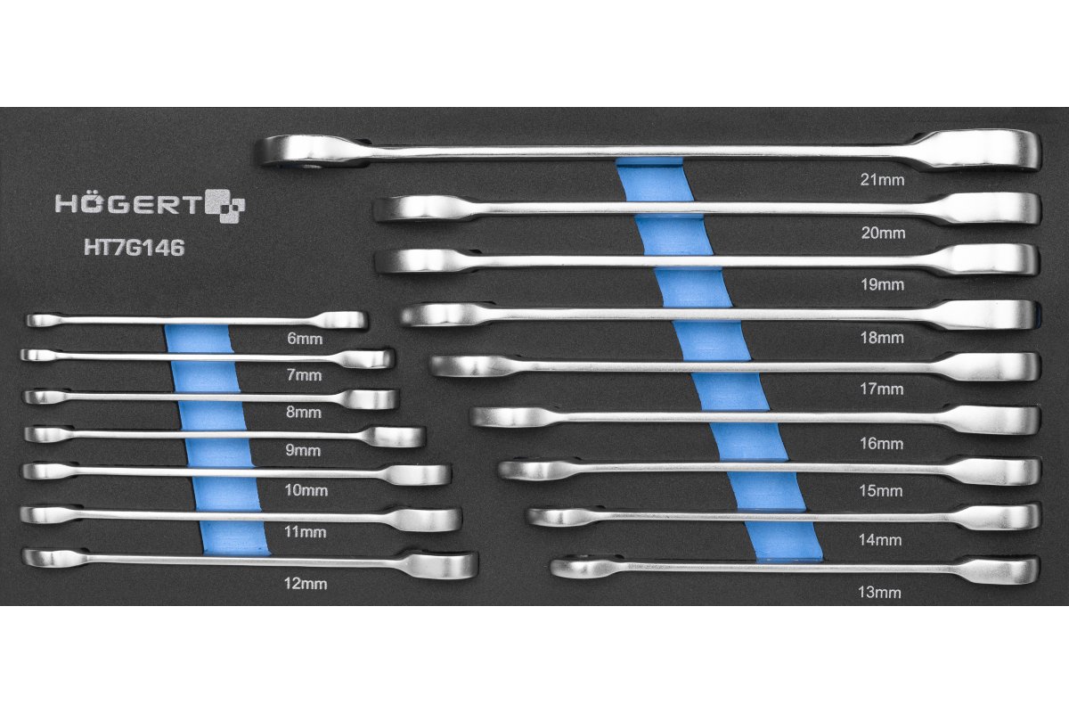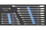 Wkład do szafek narzędziowych zawierający klucze płasko-oczkowe z grzechotką, które służą do odkręcania i przykręcania połączeń gwintowanych zakończonych elementem mocującym sześciokątnym, dwunastokątnym lub sześciokątnym typu TORX. Dzięki grzechotce nie zachodzi potrzeba przekładania klucza.