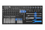 Wkład do szafek narzędziowych zawierający grzechotkę, pokrętła oraz zestaw nasadek i bitów w rozmiarze ¼”. Zestaw wybranych narzędzi niezbędny w szafce narzędziowej każdego profesjonalisty.